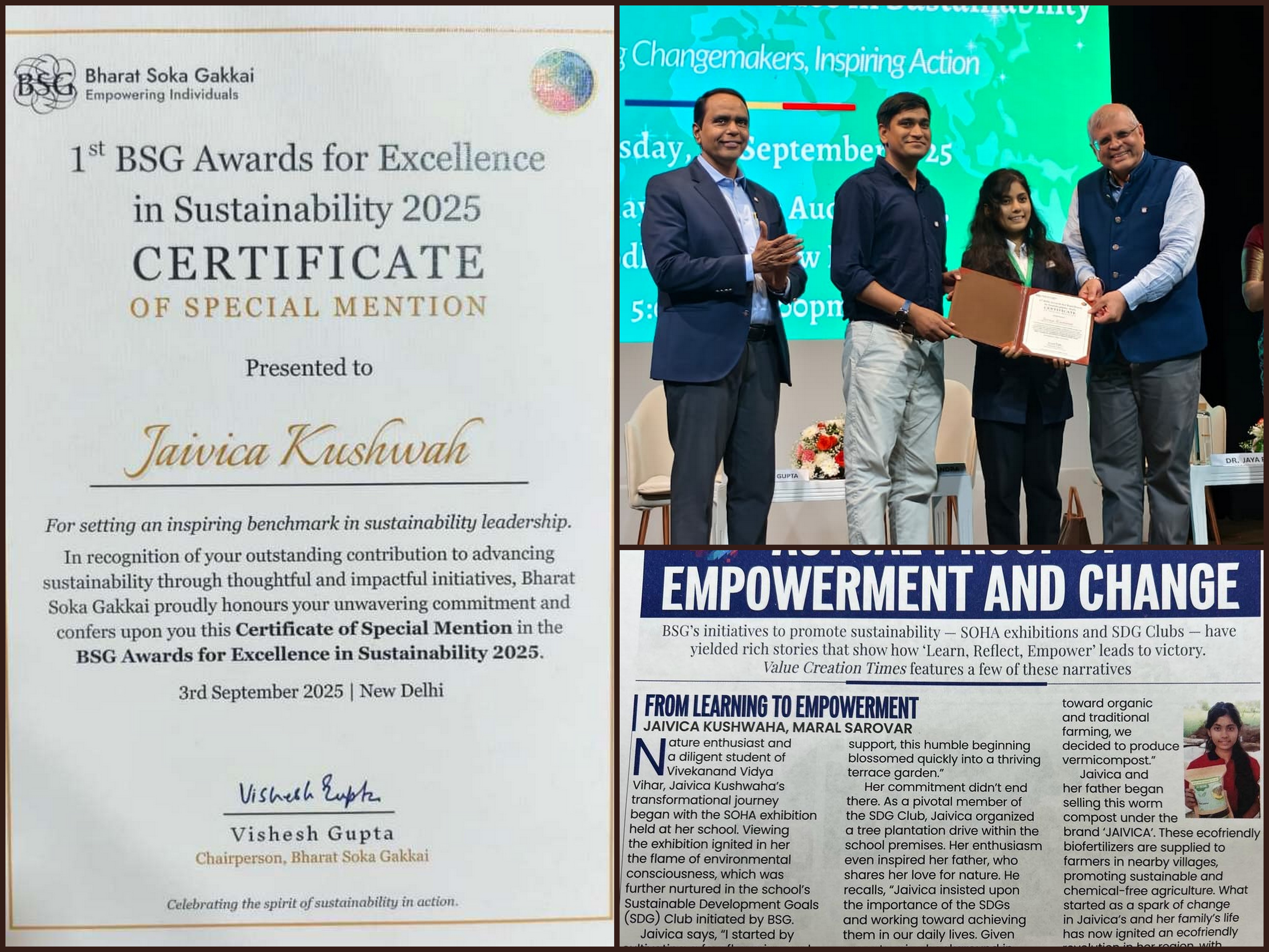 We are proud to announce that Jaivica Kushwah (Class XII) received a Special Mention at the 1st BSG Awards for Excellence in Sustainability 2025, held at the Chinmaya Mission Auditorium, New Delhi. Her outstanding work in vermicompost (organic fertilizer) earned her this prestigious national recognition, reflecting her dedication and commitment to sustainability. Jaivica’s achievement serves as an inspiring example for all students at VVV Maral.